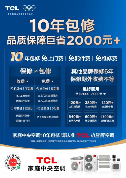 当前,TCL空调推出“十年包修”服务,凡是购买TCL家用空调小蓝翼系列、家中空调小蓝翼风管机、恒劲风二代风管机及小多联、真省电pro风管机等产品的用户,均可享受整机10年免费包修服务,全免费包括上门费、零件费、检修费和人工费,且使用原厂配件和工艺,由厂家直接负责。这一服务周期几乎覆盖了产品的全生命周期,真正实现“一次购买,十年安心”。