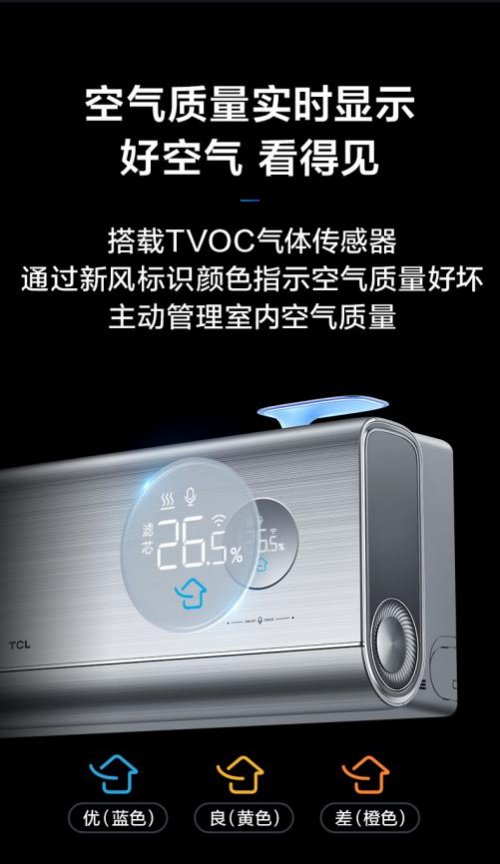 TCL小蓝翼P7 AI健康空调搭载四重HEPA滤芯,纳米级大小的滤孔能层层过滤PM2.5、细菌病毒等污染物,同时,内置TVOC气体传感器,可实时检测甲醛等多种居家常见有害气体,并通过机身指示灯颜色直观显示空气质量:蓝色代表优、黄色代表良、橙色代表差,好空气看得见,让用户对室内空气状况了如指掌,呼吸更安心。
