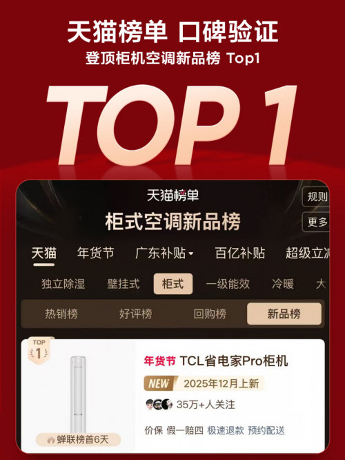 1月12日晚8点,TCL空调与天猫平台战略合作的重磅新品“TCL省电家Pro空调”正式首发,凭借其颠覆性省电技术与出色的舒适体验,入选天猫空调新品榜单。