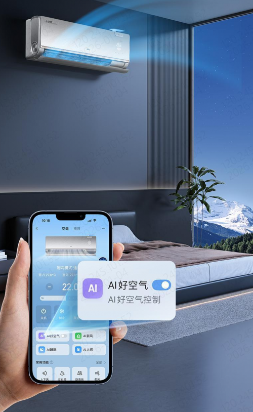 入睡时,灯光熄灭,空调智能进入“AI 睡眠”,光敏检测感知用户入睡后,将风感、风速、新风调整至最佳助眠状态,适配人体核心体温下降的生理规律,避免高温干扰入睡;深睡期维持稳定温度,应对人体代谢最慢、产热最少的状态,避免温度波动打断深睡;晨起期则切换 AI 人感模式,智能识别人体位置,实现 “风吹人”“风避人”“无人节能”,微调温度避免晨起不适。