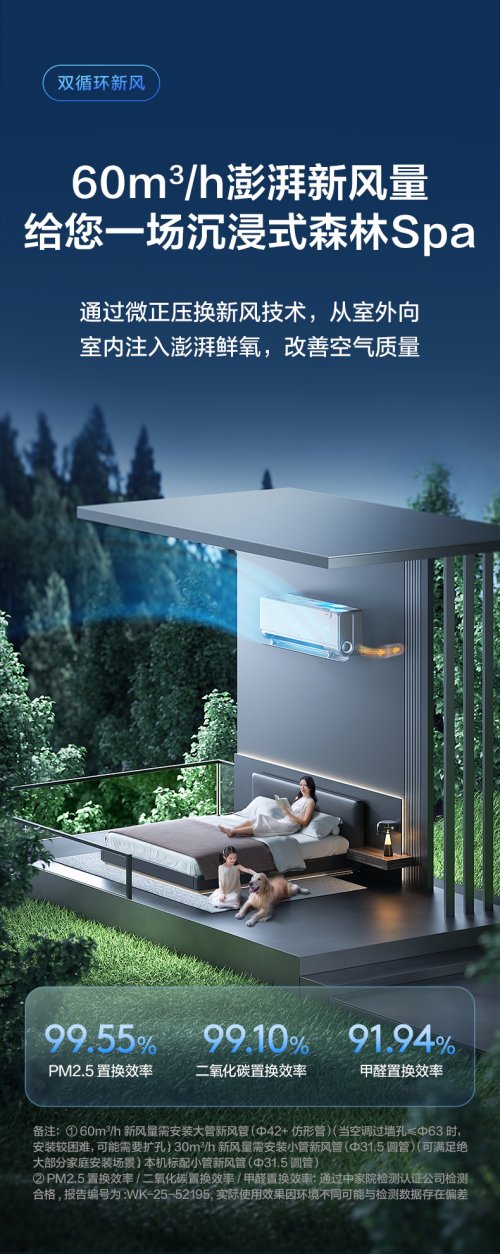 TCL小蓝翼P7 Ultra AI健康空调的双循环新风系统,恰好精准适配了新春团聚的睡眠场景,以60m³/h的澎湃风量,通过微正压技术将室外新鲜空气过滤后注入室内,同时排出室内污浊空气,不开窗也能实现空气循环。它就像一个不知疲倦的“空气管家”,一晚能完成多次次卧室空气焕新,无论是孩子玩耍留下的粉尘,还是亲友聚会残留的烟酒味,都能被高效过滤。其PM2.5置换效率高达99.55%,二氧化碳置换效率99.10%,甲醛置换效率91.94%,哪怕是新装修的婚房,也能快速降低甲醛浓度,让新人在新春期间安心入住。