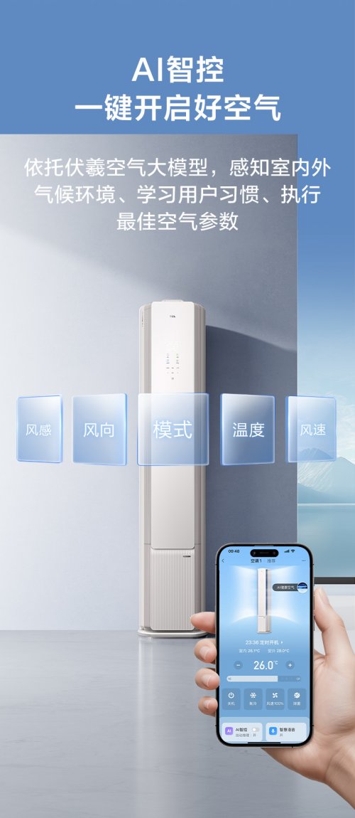 智能化是TCL P6 Plus AI健康空调的另一大法宝。拥有AI智控功能,依托伏羲空气大模型,它能够自主感知室内外气候环境,学习用户的使用习惯,并自动执行最佳的空气参数设置。无论是湿度调节还是温度控制,都能精准到位,一键开启好空气。